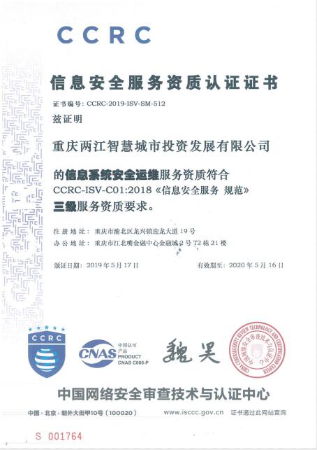 “信息系统安全集成服务”、“信息系统安全运维服务”两项资质的取得是中国信息安全认证中心对两江智慧城投公司专业能力、管理水平、人员资质、服务质量等各项综合实力的认可,同时,两江智慧城投公司的企业资质得到了进一步的巩固,有效提升了公司承接“智慧城市”领域安全集成、安全运维相关项目的市场竞争力,为公司的持续发展奠定了更为坚实的基础,是公司在“智慧城市”领域发展历程上的又一里程碑。