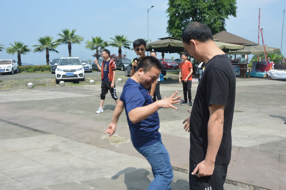 组队成功后,素质拓展培训正式开始,首先是“拳王争霸”游戏,“3,2,1……开始!”随着教官哨响,两队队员奋力直追,赢了的欢呼着跑到“拳王”身后,下一个队友又接着上,输了的短暂叹息之后立马掉头跑回起点重新来过,直到划赢拳王。培训现场充满了呐喊声,欢呼声,加油声,场面十分热烈。