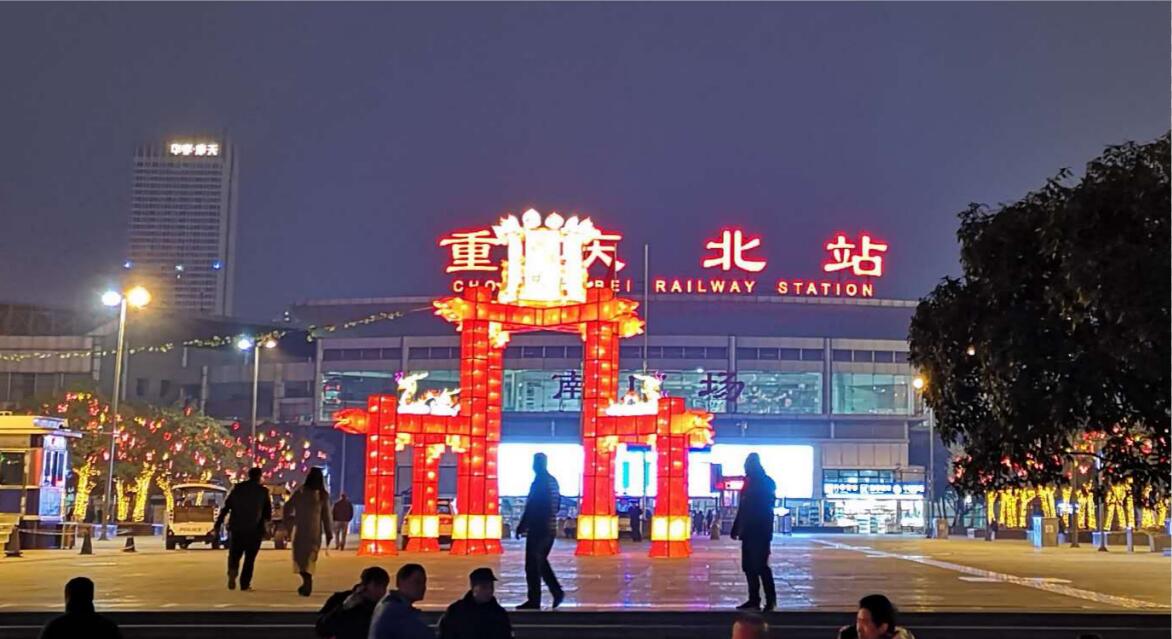 重庆火车北站北广场采用回纹造型配以大红灯笼高高挂,以大红色的星型挂件布满树枝,表达了欢迎游子归来的急切心情;南广场采用金黄色的满天星缠绕树干,心形挂件点缀,表达心系家、家团圆的新年祝愿。
