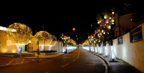 星光大道沿线灯杆花架采用金黄色的满天星包裹,周边行道树采用红色的灯笼挂件和发光球点缀,展现了浓浓的节日气息。