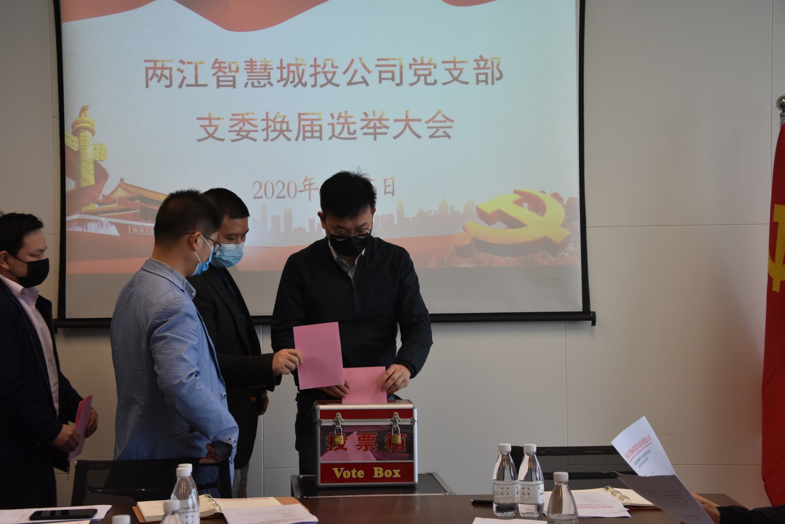 两江智慧城投公司党支部于2018年2月12日成立,现有党员16名,其中正式党员14名,预备党员2名。本次大会应到正式党员14名,实到正式党员12名,符合选举的有关规定。大会听取了上届支部书记李伟作的工作报告,宣读了金融公司党委批复并介绍候选人情况,表决通过了支委委员候选人预备人员名单,审议了《选举办法(草案)》,对提名的监票人和计票人名单进行了举手表决,最后进行了投票选举,李伟、吴新中、曾令乾三名同志当选为新一届公司党支部委员。在随后进行的支委会议上,李伟同志当选为公司党支部书记。