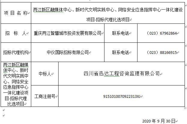 两江新区融媒体中心、新时代文明实践中心、网络安全应急指挥中心一体化建设项目-招标代理比选项目中标结果公示