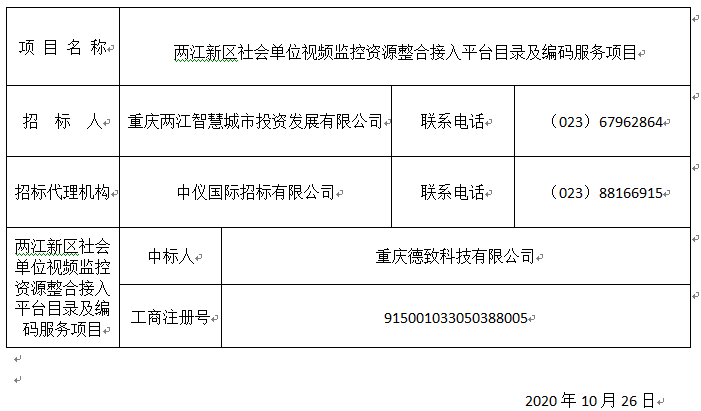 两江新区社会单位视频监控资源整合接入平台目录及编码服务项目中标结果公示