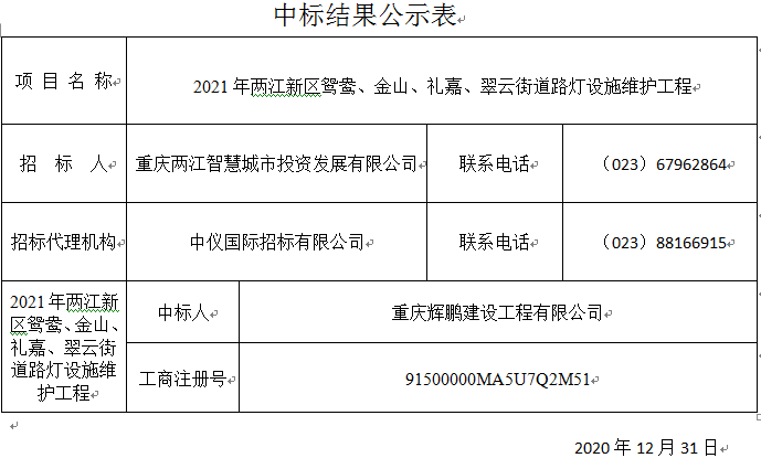 2021年两江新区鸳鸯、金山、礼嘉、翠云街道路灯设施维护工程中标结果公示
