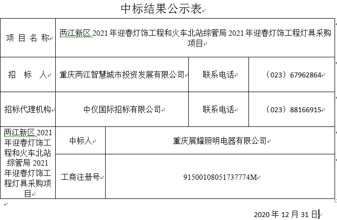 两江新区2021年迎春灯饰工程和火车北站综管局2021年迎春灯饰工程灯具采购项目中标结果公示