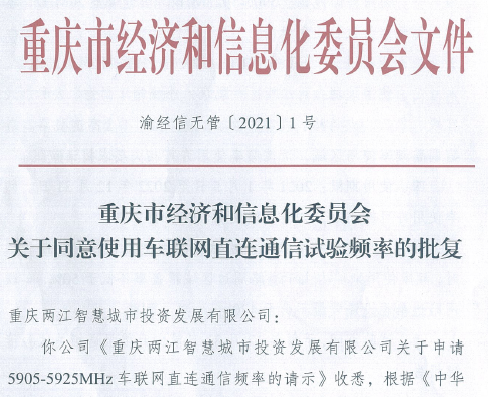 近日,重庆市经济和信息化委员会批复江北嘴投资集团旗下两江智慧城投公司“同意使用车联网直连通信试验频率”,这标志着公司正式获得了5905-5925MHz车联网专用频段使用权。